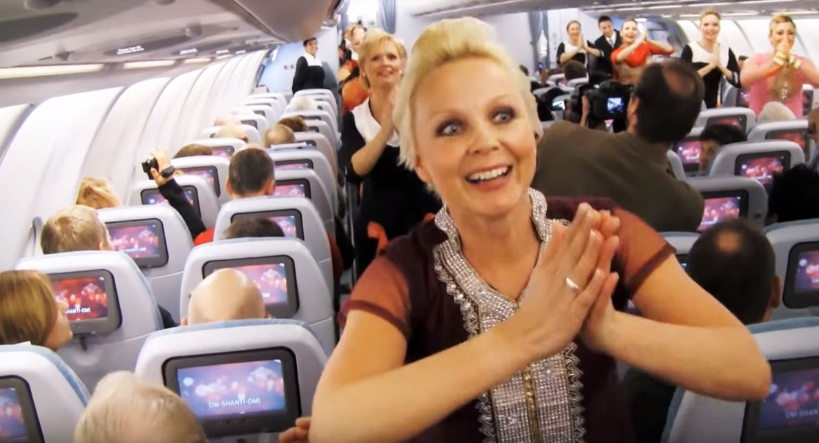 Passengers on Flight 21 watched in shock as the flight attendants paraded around the cabin trying their hardest to perform the Bollywood-style moves to Om shanti Om.