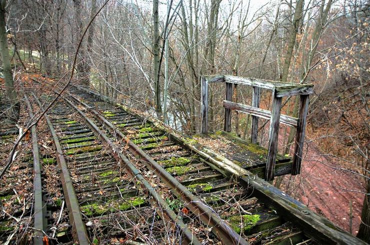 This abandoned railway is clearly pretty old, considering the rail ties have almost entirely rotted away in the middle from foot traffic and general neglect.