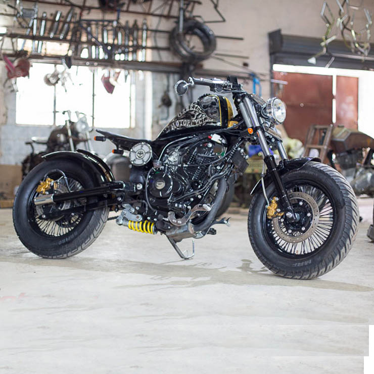 Gabriel Motorcycles have come up with a Bobber motorcycle based on a Bajaj Pulsar 220. The alloys have been replaced with spoke wheels and are shod with slightly wider tires (the front gets 130 mm and rear 150 mm). The fenders are custom made and so are the knuckle duster foot pegs. The twin gas shock absorbers of the stock motorcycle have been replaced with an underbelly monoshock while the original exhaust too has made way for an underbelly setup. Other highlights include a custom-made flame shaped Brake & Gear pedal levers, laser engraved air filter & battery box, a single seat, and bar-end rear view mirrors. Also, this motorcycle gets a really very attractive air-brushed paint job.
