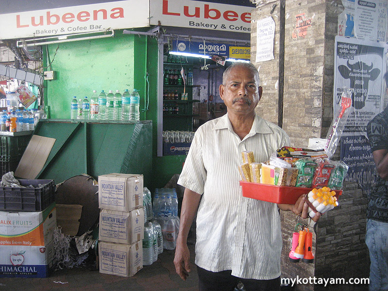 Mr Shahul Hameed is perhaps the very first vendor in Kottayam private bus stand, who has always stuck to the same place during his 40 years of selling career. His product range has remained more or less the same – safety pins, combs, small toys, ear buds, peanut candy (kadala mittai), ginger toffee, vayu gulika, paal kaayam (a stomach cleanser with Arab origin), ayamodakam, black pepper concentrate (kurumulaku sathu), small torch lights etc.