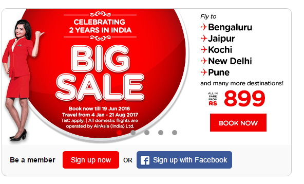 Low-cost carrier AirAsia India has celebratory offer for flyers as it at the completed of 2 years of flying in the counrty.To commemorate the occasion, AirAsia is offering celebratory all-in fares starting at Rs 899 across its network of 10 domestic as well as more than 120 international destinations across 24 countries served by AirAsia and AirAsia X Groups.