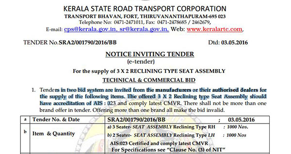 KSRTC called tenders for the supply of 3×2 Reclining type seat