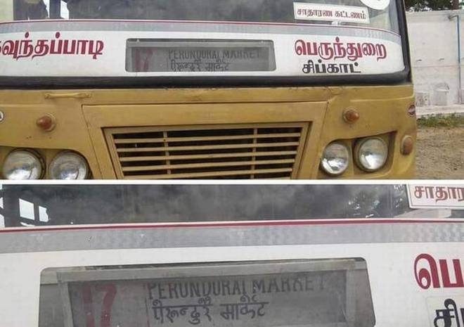 TNSTC officials told The Hindu that K. Sreenivasan, the conductor, reportedly put up a route board written in English and Hindi on his own instead of using the one issued by the Corporation for the journey from Kavindapadi bus stand to SIPCOT industrial estate at Perundurai where lots of migrant workers from northern and eastern States work.