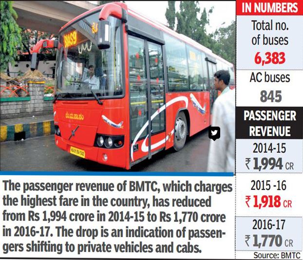 BMTC’s passenger revenue has reduced from Rs 1,994 crore in 2014-15 to Rs 1,770 crore in 2016-17. Though it does not have revenue break-up for AC buses, the reduction is an indication of passengers shifting to private vehicles and cabs. BMTC has the highest fare in the country and activists have been demanding a reduction.