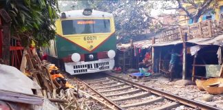 കൊൽക്കത്തയിൽ ആളുകൾ താമസിക്കുന്ന വീടുകൾക്കിടയിലൂടെ ഒരു ട്രെയിൻ – വീഡിയോ