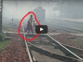 Lady with Child in front of 130+ KMPH Kanpur Shatabdi Express