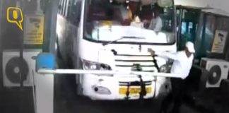Refusing to pay fee, bus driver tries to run over toll...