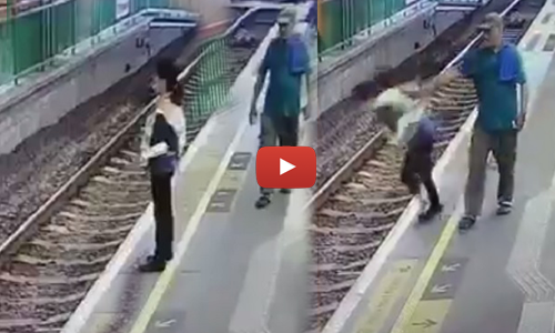 The culprit is seen walking along the platform behind the victim, who is waving to someone on the other side of the tracks. The man then shoves her in the back, causing her to fall off the platform, and walk away without breaking stride.