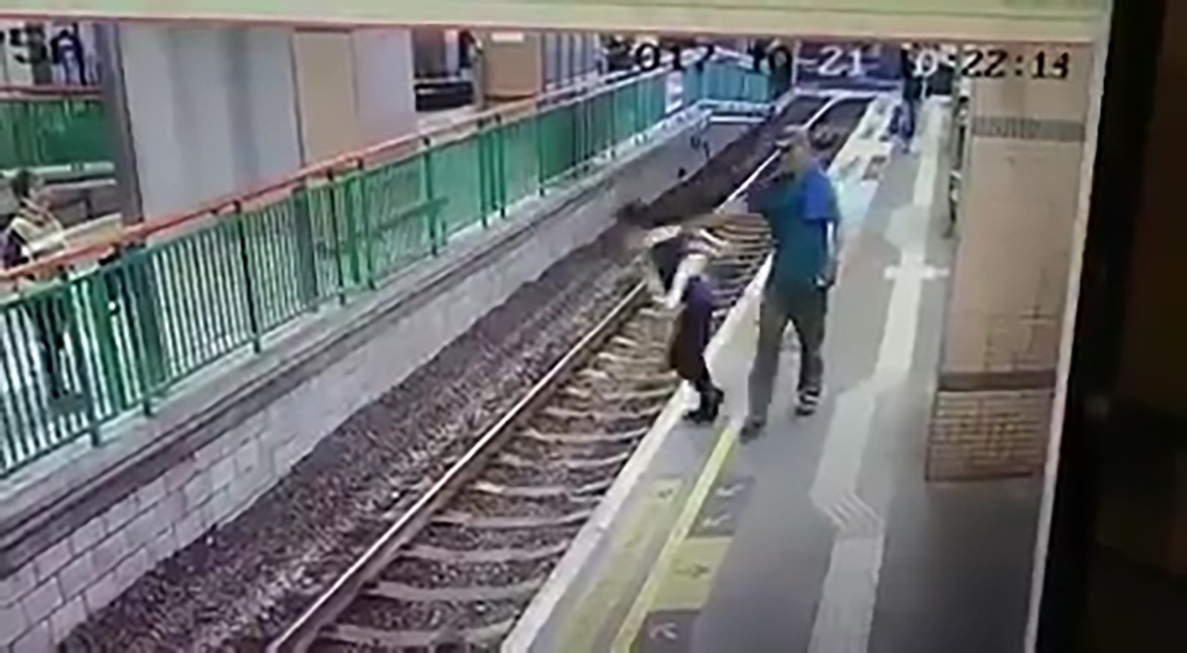 The culprit is seen walking along the platform behind the victim, who is waving to someone on the other side of the tracks. The man then shoves her in the back, causing her to fall off the platform, and walk away without breaking stride.