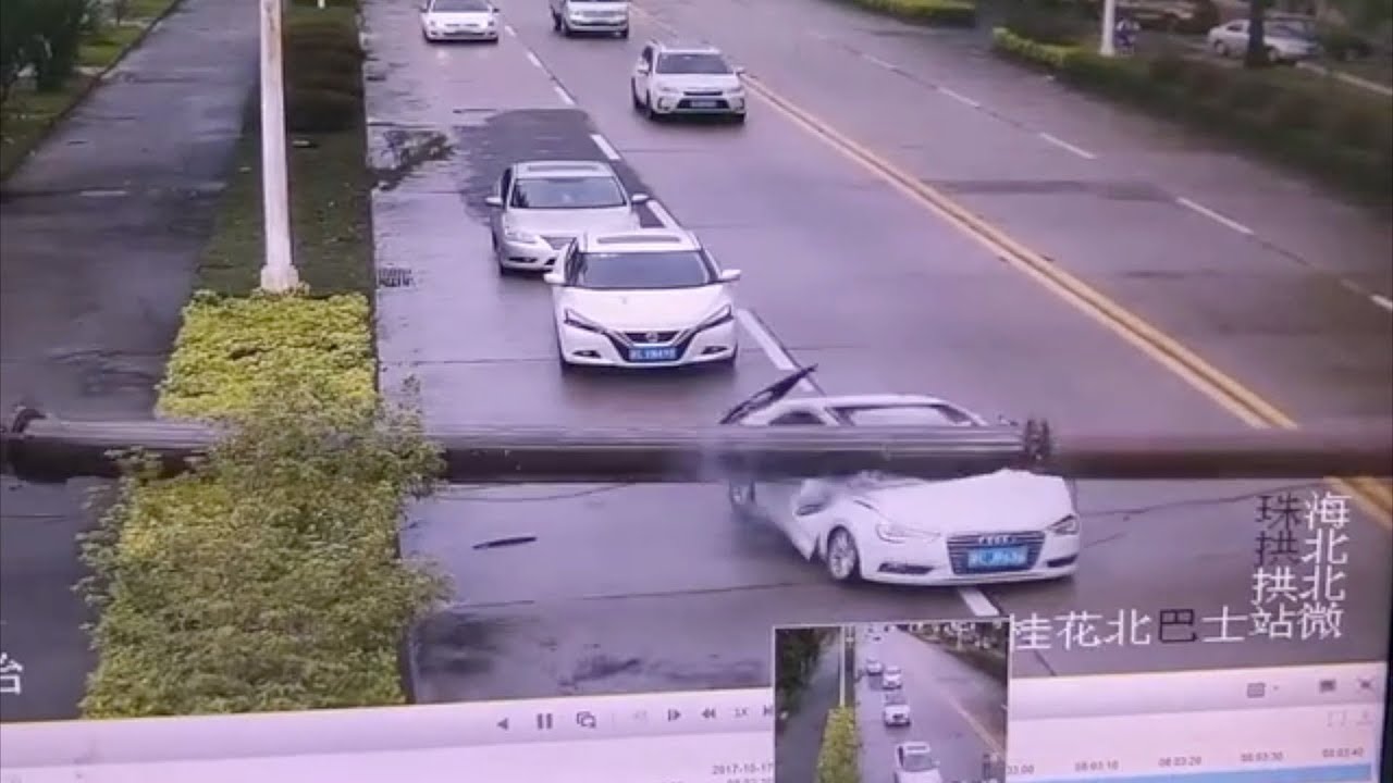 CCTV footage posted on Pear Video captures how the long boom fell onto the windscreen of the moving Audi in Zhuhai, Guangdong Province.