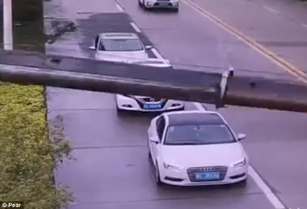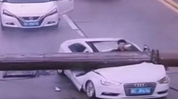 CCTV footage posted on Pear Video captures how the long boom fell onto the windscreen of the moving Audi in Zhuhai, Guangdong Province.