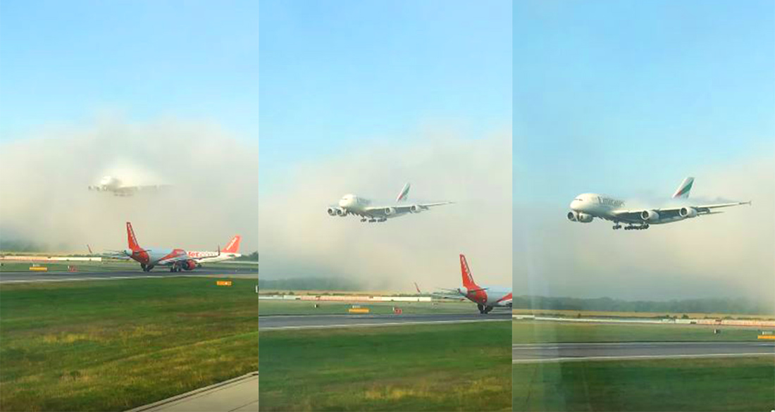 This is the moment an Emirates plane seemingly appeared from nowhere to land on a London runway.