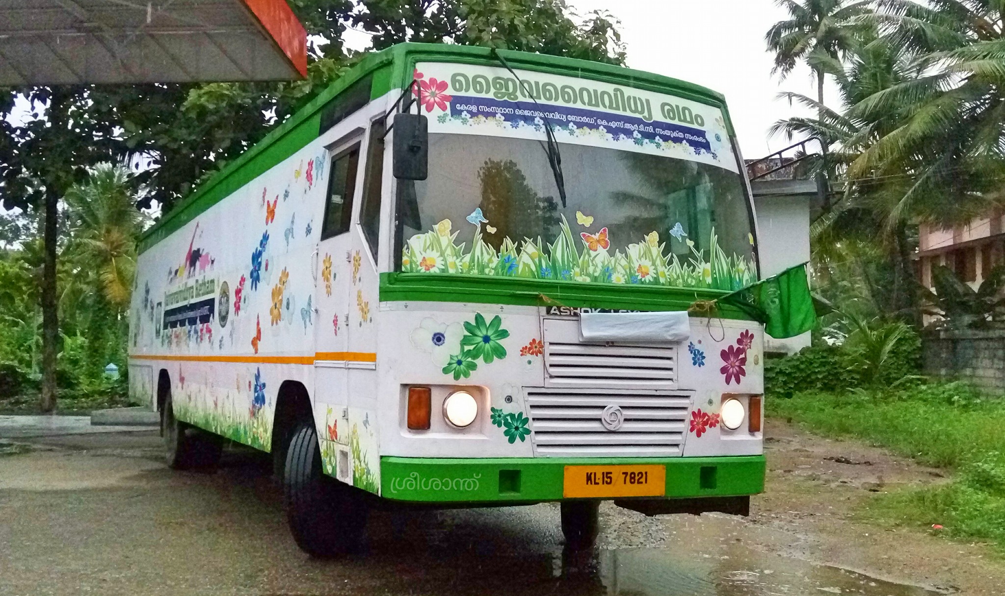 ഇങ്ങനെയൊരു ബസ് ചില സമയങ്ങളിൽ നിങ്ങൾ കണ്ടിട്ടുണ്ടാകും. ഒന്നുകിൽ യാത്രയ്ക്കിടെ അല്ലെങ്കിൽ ഏതെങ്കിലും കെഎസ്ആർടിസി ബസ് സ്റ്റാൻഡിൽ. എന്താണ് ഇതെന്ന് നിങ്ങൾ ഒരിക്കലെങ്കിലും ചിന്തിച്ചിട്ടുണ്ടാകും. വിഷമിക്കേണ്ട അറിയാത്തവർക്കായി പറഞ്ഞുതരാം. സംസ്ഥാന ജൈവൈവവിധ്യ ബോര്ഡിന്റെയും കെഎസ്ആര്ടിസി യുടെയും സംയുക്ത സംരംഭമായ ജൈവവൈവിധ്യ രഥമായിരുന്നു ഈ കാണുന്ന ബസ്. വനം-പരിസ്ഥിതി വകുപ്പു മന്ത്രിയായിരുന്നപ്പോൾ തിരുവഞ്ചൂര് രാധാകൃഷ്ണന്റെ പ്രത്യേക താല്പര്യപ്രകാരമാണ് ഈ സംരംഭം ഒരുങ്ങിയത്.