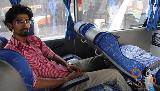 The bus had 49 semi sleeper seats manufactured by Harita seatings. The leg space was just adequate but could have been better but the seats are comfortable. Speakers, AC vents and reading lamps are configured above all rows. A power socket is also provided for every row which can be used for charging mobile phones and other portable devices.