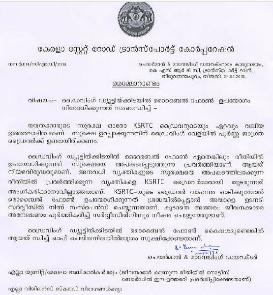 The KSRTC MD has issued a memo warning drivers from using mobile phones while driving. From now on, the drivers are asked to keep their mobile phones switched off while driving.