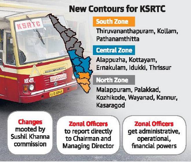 Amalgamation of the existing five zones in the Kerala State Road Transport Corporation (KSRTC) to three zones and entrusting their control to the zonal officers, armed with sweeping powers, as mooted by the Sushil Khanna commission to strengthen the service operations will take off on Wednesday.