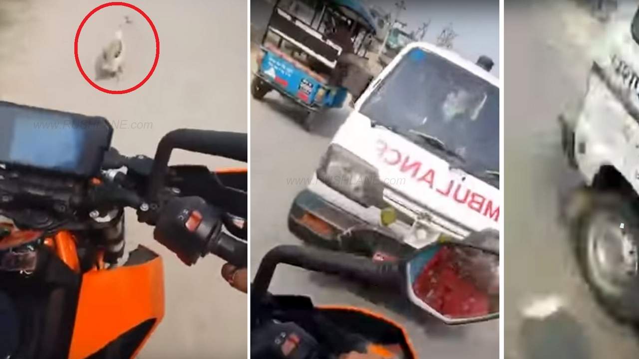 After riding over the duck, the KTM Duke 390 rider start racing on the road and is riding dangerously. Within seconds, he crashes head on into an ambulance, which has the words Pashu written on it.