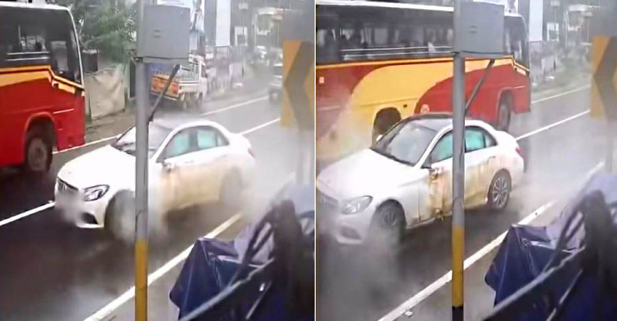 This video from CCTV footage shows a curved road with heavy rainfall. The cars can be spotted taking high speed turns and there is stagnant water right on the corner. While other cars miss the puddle and pass through safely, the Mercedes-Benz C-Class driver can be seen taking a wide corner and in the process, hitting the puddle. The high-speed car loses grip and slides sideways to hit a pole. The airbags of the car also open due to the high-speed impact.
