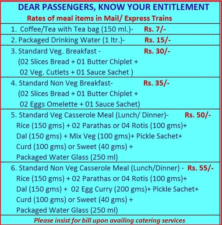 This is more or less the same for all Rajdhani and Shatabdi trains in India and the price for all meals is already included in the fare. For Mail/Express trains, one can buy food from the IRCTC vendors. There is again fixed menu and fixed tariff for these train menus. Below picture depicts the food items and rate card for paid food.
