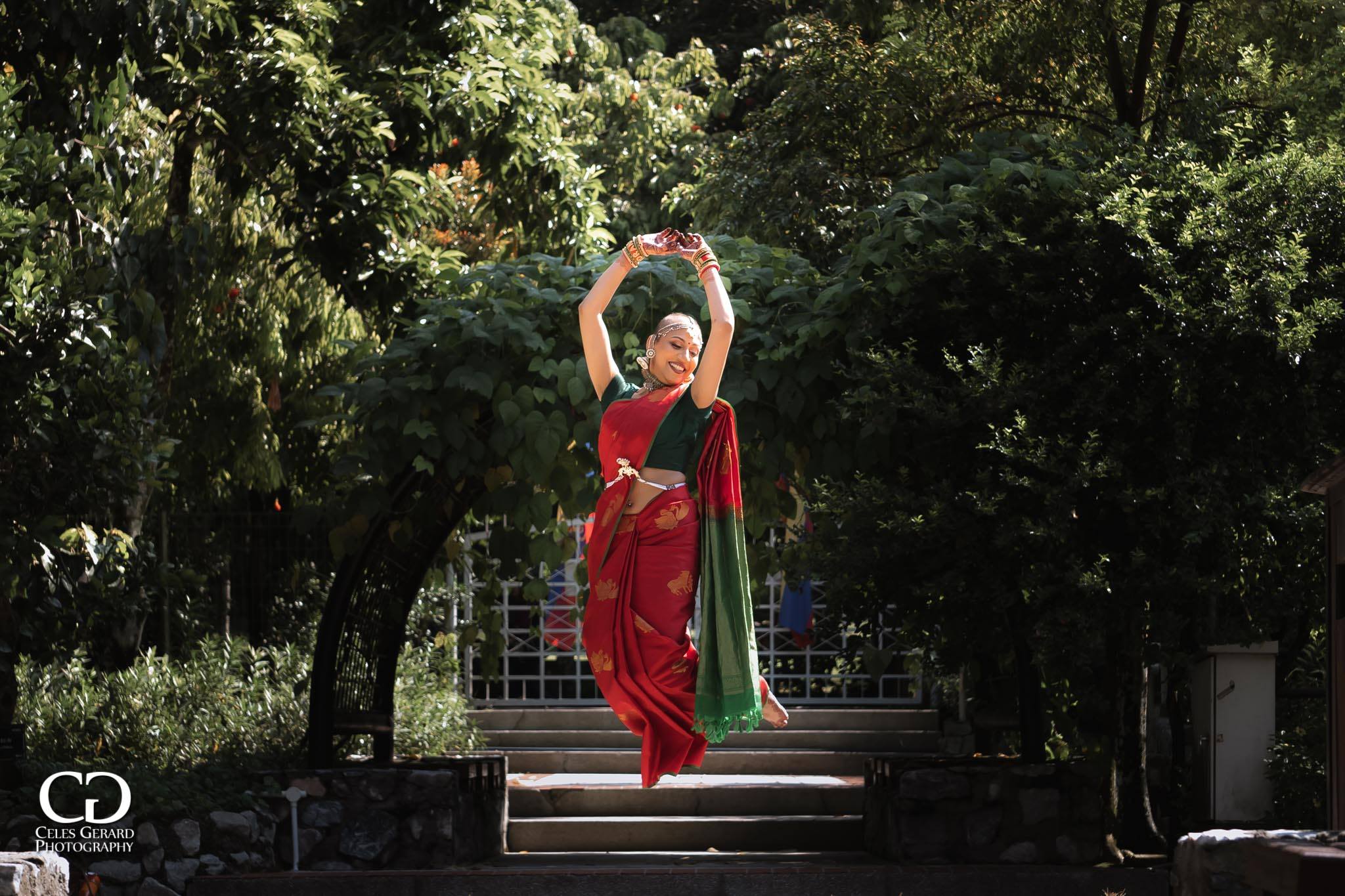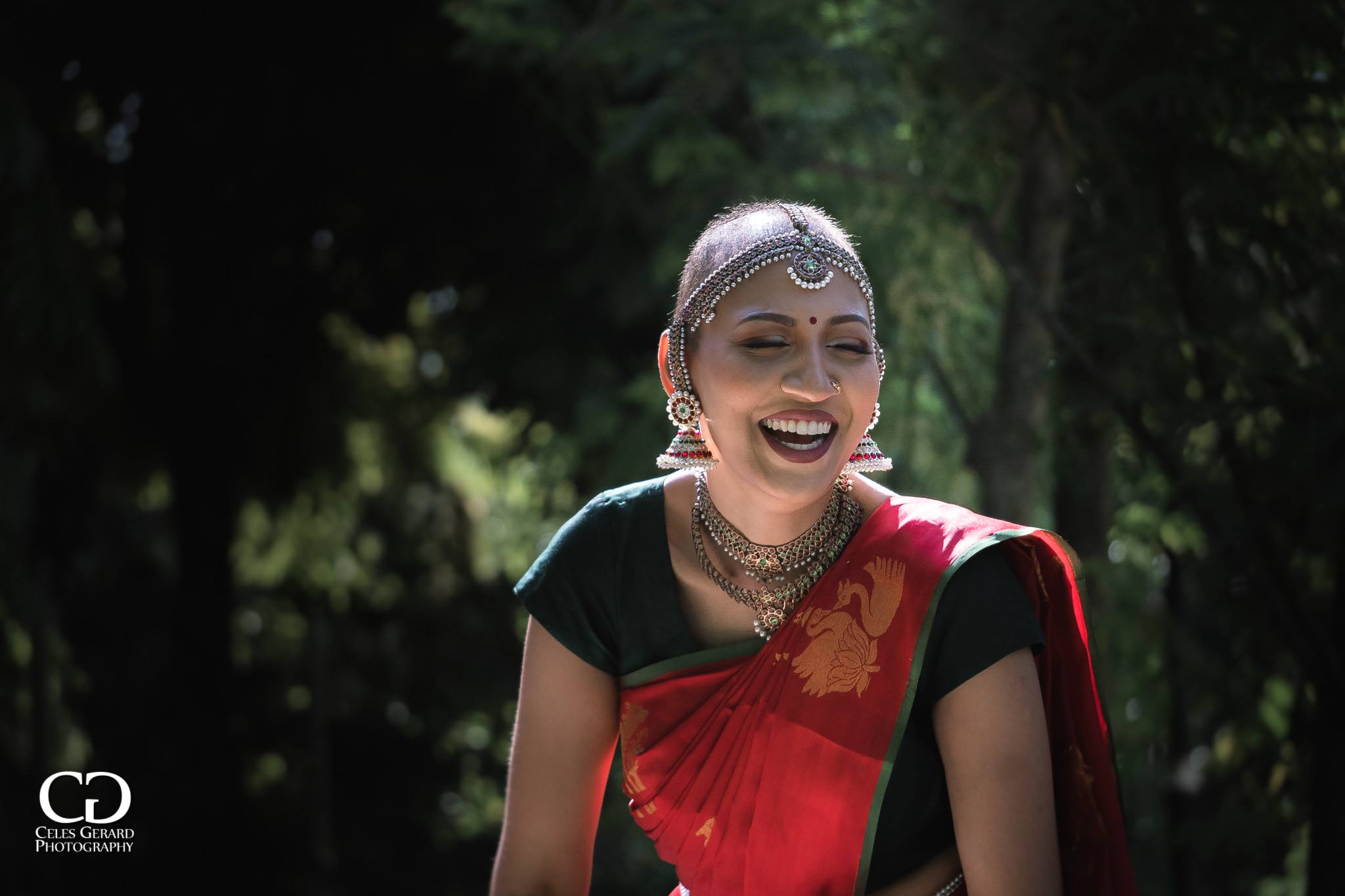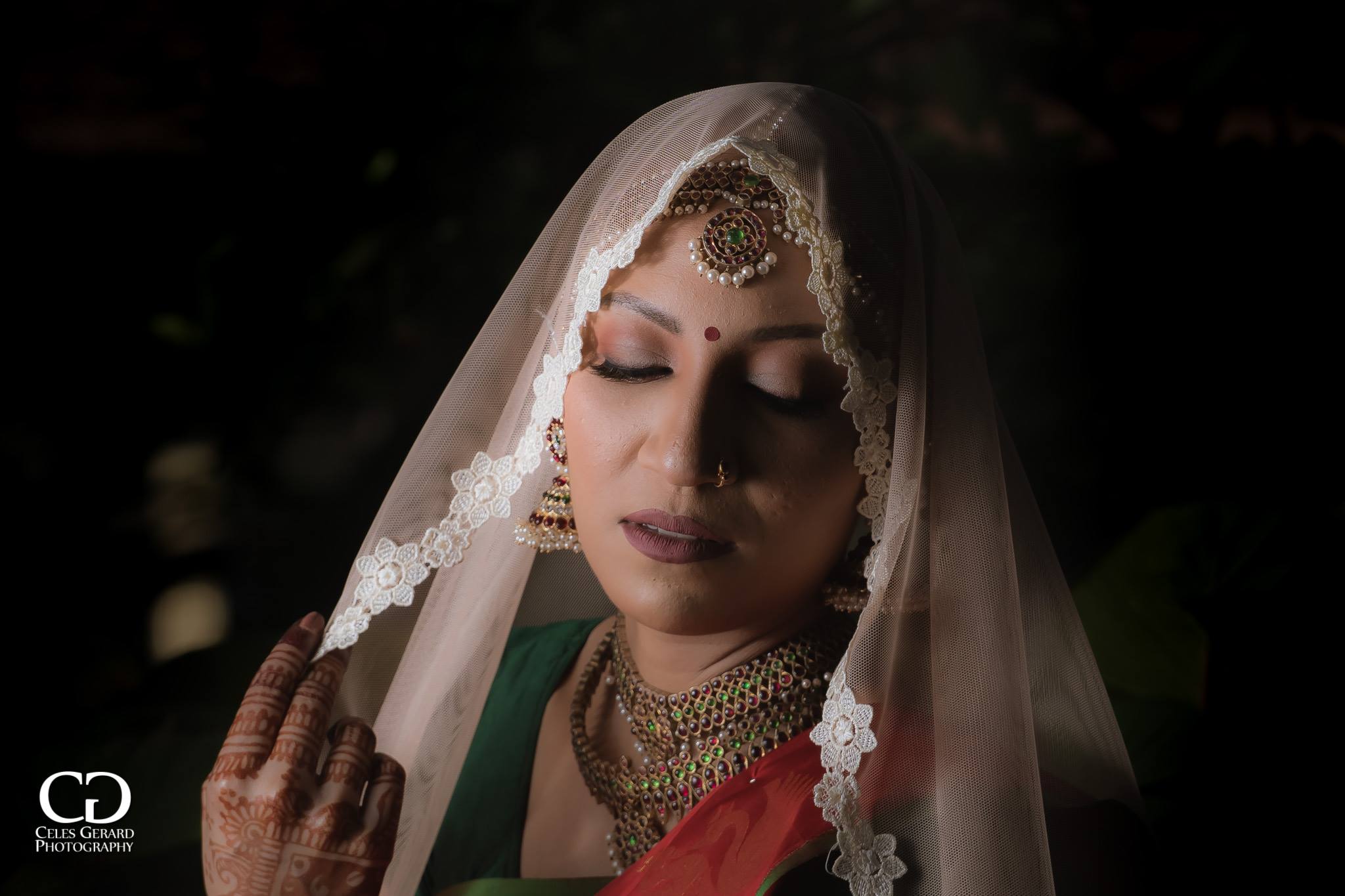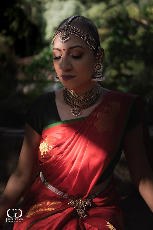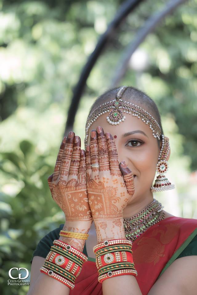 Dressed in a bight tomato red saree with a white tulle veil, and with mehendi on her feet and hands, Poovanedran is a breathtakingly beautiful bride in the photos. The photographs—taken by photographer Celes Gerard—have struck a chord with thousands of women.