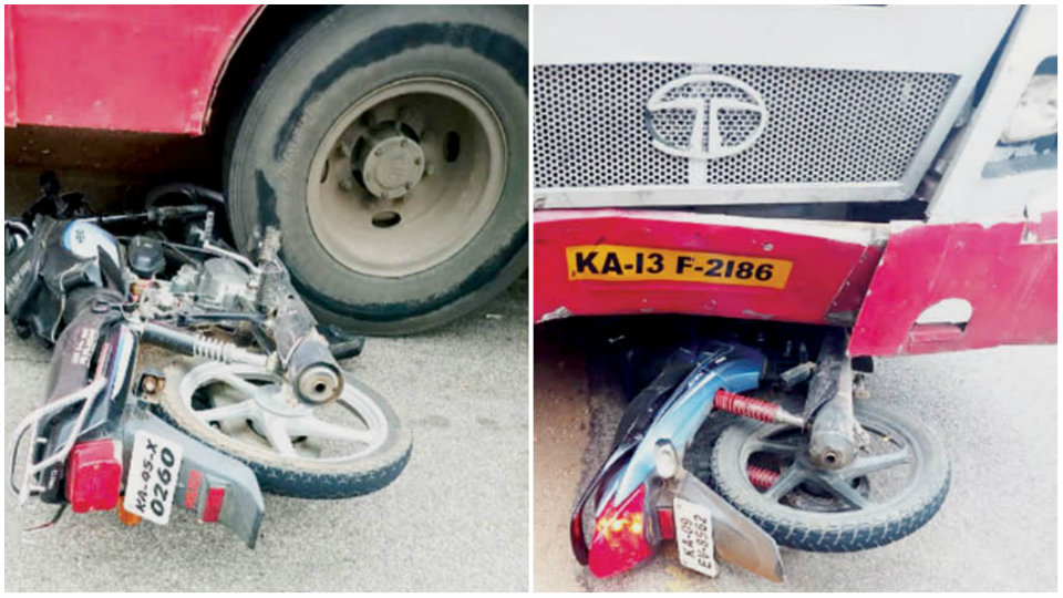 It is reported that Madhu and Manjula couple were proceeding from Bherya to Gandhanahalli village on their bike when a KSRTC bus (KA-13 F-2186), belonging to Hassan Depot and moving from Hassan side towards Mysuru, rammed into the bike from behind, killing Madhu on the spot and then collided head-on with another bike on which Naveen and his mother Padmamma were travelling resulting in Padmamma’s death.