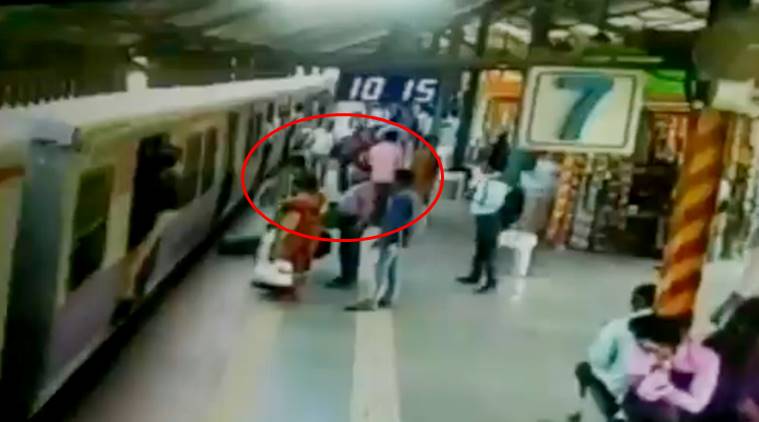 #WATCH: Railway Protection Force (RPF) personnel rescues a woman passenger from being run over by a Parvel-bound train at Kurla Railway Station in Mumbai (03.04.18) pic.twitter.com/2mdX8lZLXv